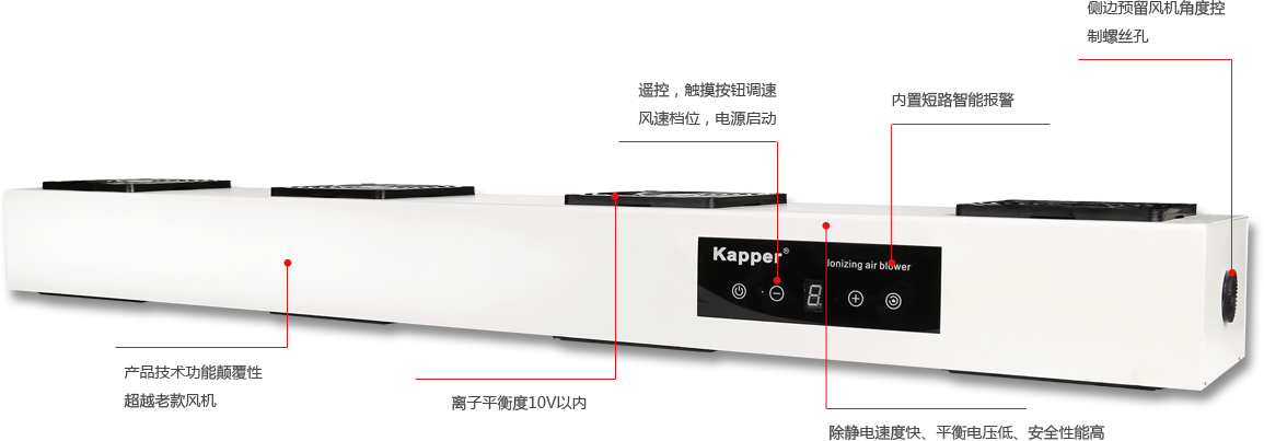 Kapper卡帕爾品牌打造科技創新,爭創行業品牌,已成功由產品機械化轉向產品智能化,將引領靜電設備行業進入智能化、科技化,也將掀起防靜電設備行業科技創新風潮,成為具 有高度競爭力和領先性優勢的開創型企業。產品應用涵蓋電子、化工、印刷、LED、LCD顯示器、半導體生產線、包裝等諸多行業,產品覆蓋全國各地,并遠銷海外。